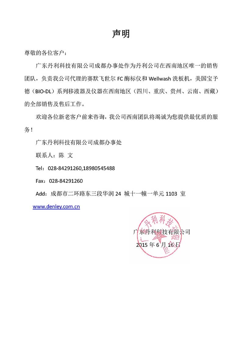 尊敬的各位客戶: 廣東丹利科技有限公司成都辦事處作為丹利公司在西南地區唯一的銷售團隊,負責我公司代理的賽默飛世爾FC酶標儀和Wellwash洗板機,美國寶予德(BIO-DL)系列移液器及儀器在西南地區(四川、重慶、貴州、云南、西藏)的全部銷售及售后工作。