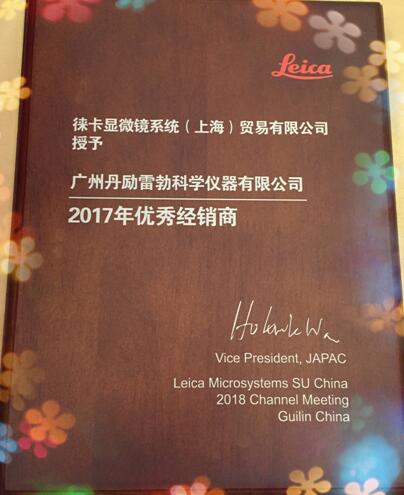 2018年1月26日,作為徠卡公司廣東省醫療及公共事業的簽約代理,廣州丹勵雷勃科學儀器有限公司(丹利集團旗下子公司)參加了徠卡2018年度經銷商大會暨答謝宴。2017年度,廣州丹勵雷勃科學儀器有限公司共計完成徠卡訂貨量130.6萬美金(僅寬場顯微鏡部分),YOY同比增長131%,喜獲徠卡2017年度優秀經銷商大獎!