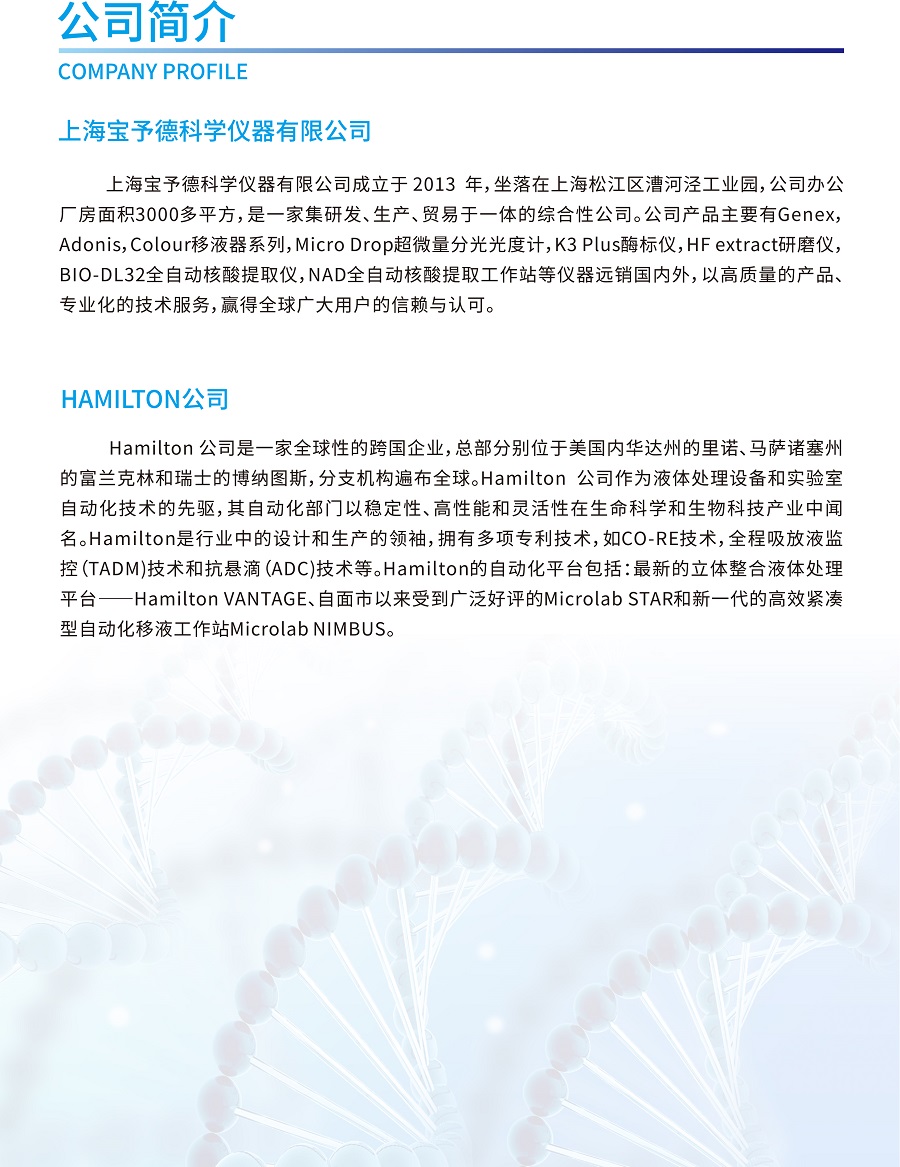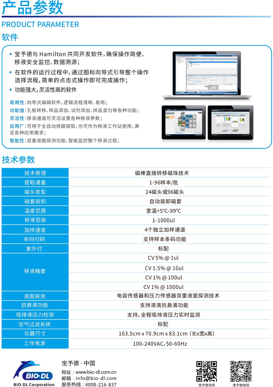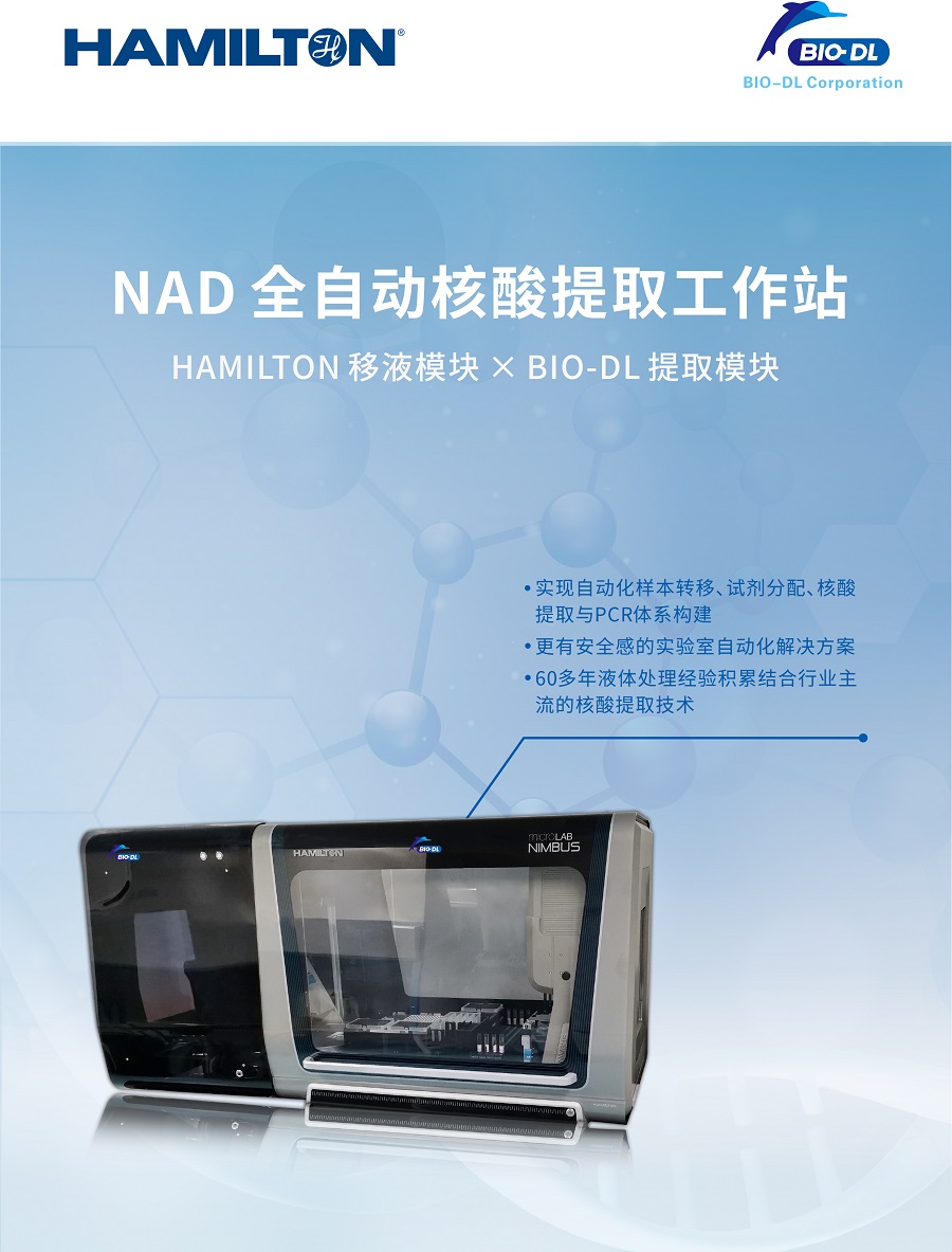 實現自動化樣本轉移、試劑分配、核酸提取與PCR體系構建;更有安全感的實驗室自動化解決方案;60多年液體處理經驗積累結合行業主流的核酸提取技術; NAD全自動核酸提取工作站是由NIMBUS移液工作站和BIO-DL核酸提取模塊整合,在一套系統上實現樣品轉移、試劑分配、核酸提取以及PCR反應體系構建等全流程的自動化。