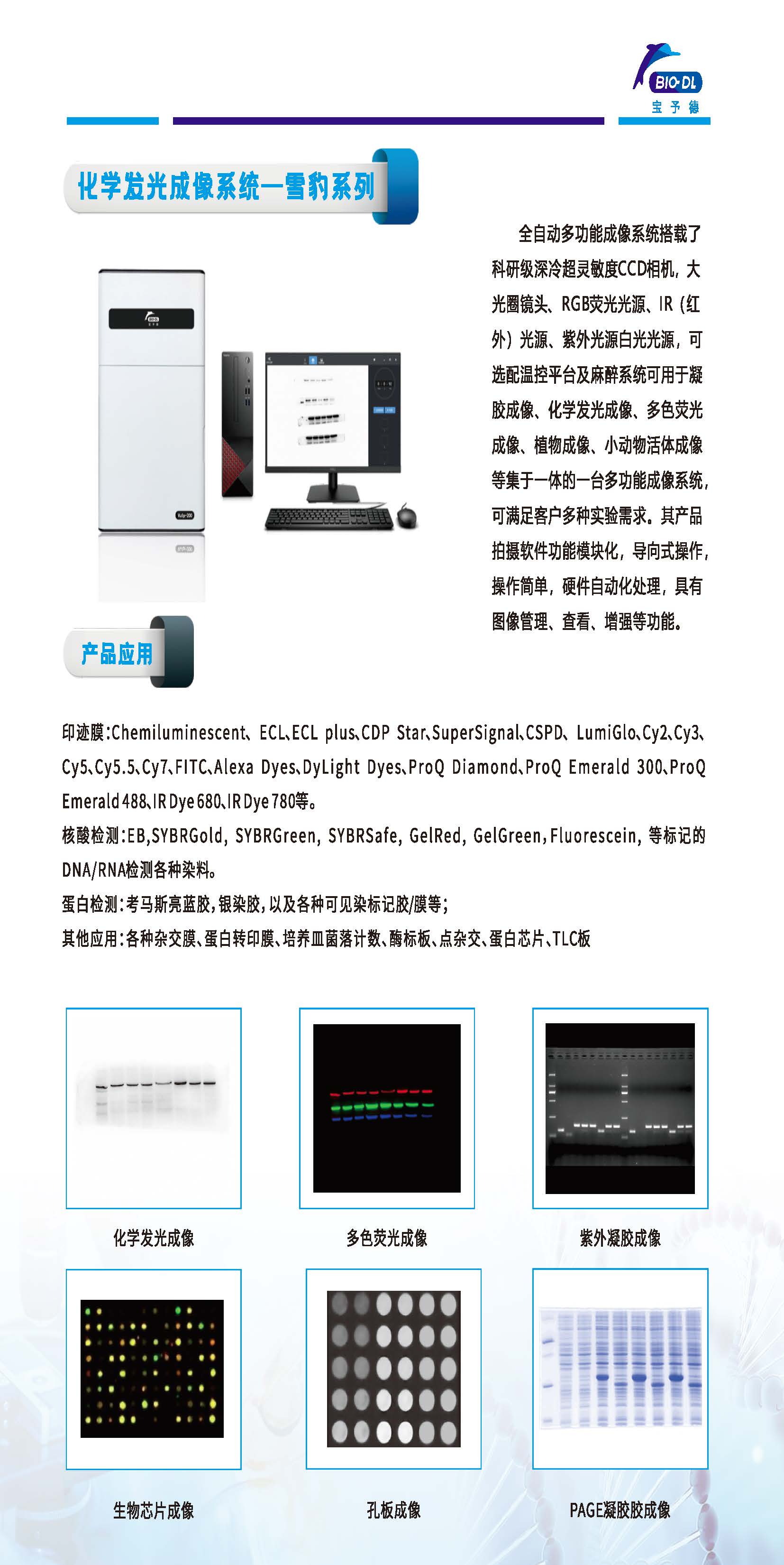 全自動多功能成像系統搭載了科研級深冷超靈敏度CCD相機,大光圈鏡頭、RGB熒光光源、IR (紅外) 光源、紫外光源白光光源,可選配溫控平臺及麻醉系統可用于凝膠成像、化學發光成像、多色熒光成像、植物成像、小動物活體成像等集于一體的一臺多功能成像系統可滿足客戶多種實驗需求。其產品拍攝軟件功能模塊化,導向式操作操作簡單,硬件自動化處理,具有圖像管理、查看、增強等功能。